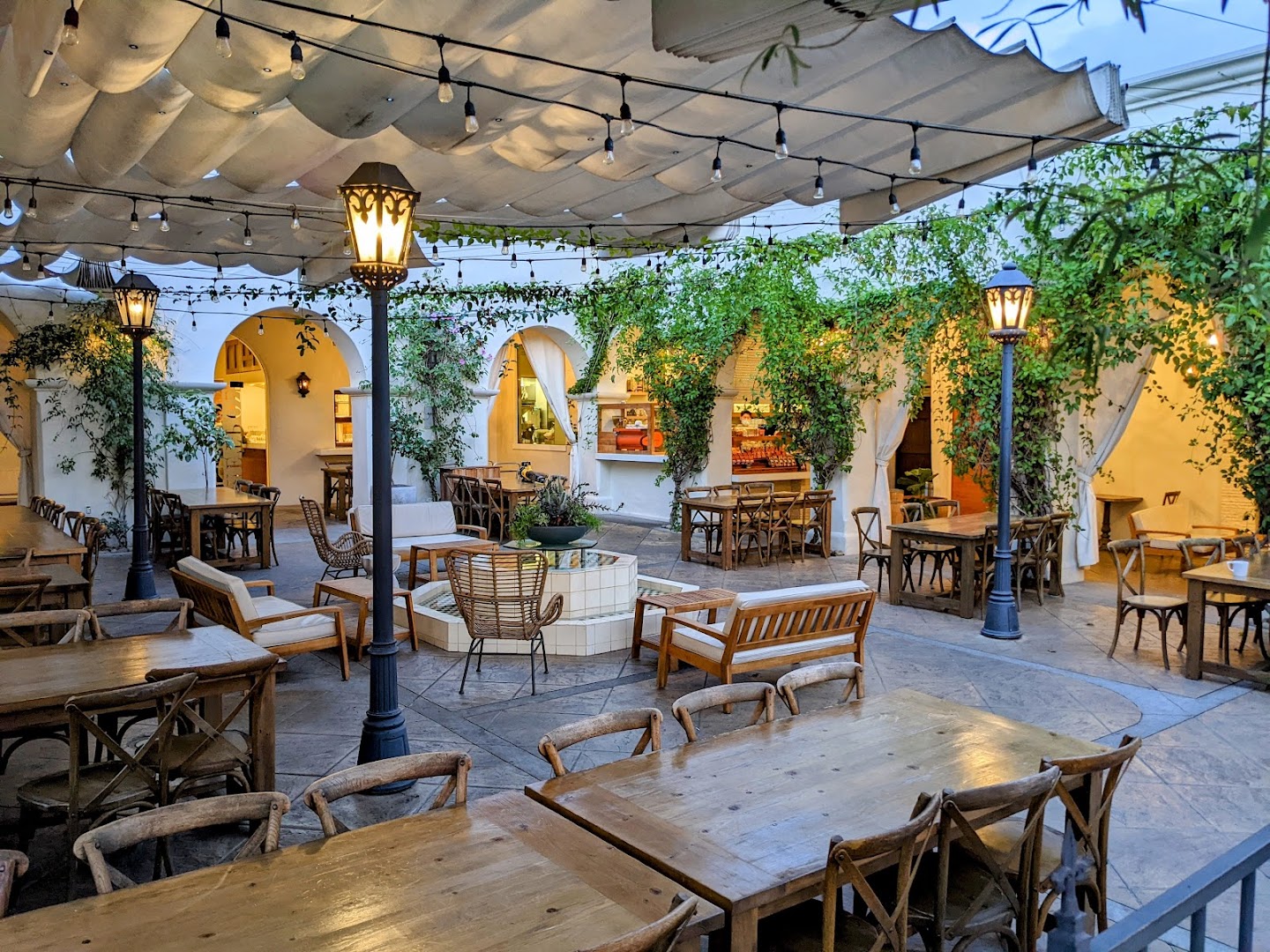 🌿 Inviting outdoor courtyard with communal and shaded seating
