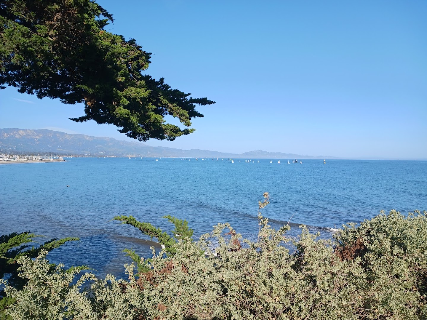 Santa Barbara Point offers visitors a scenic coastal peninsula where ocean vistas and sailing boats define the landscape. The area includes walking paths lined with old trees, free parking nearby, and peaceful benches to relax and watch seagulls by the Pacific.