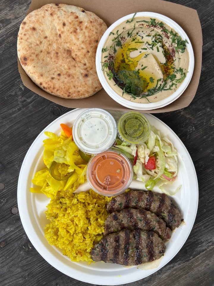 Chicken Shawarma Sandwich, Lamb Kofta Plate, Falafel Sandwich, Hummus & Pita, Fattoush Salad, Pickled Vegetables, Labneh Dips, Sumac Strawberry Lemonade, Chocolate Peanut Butter Crackle Cookies
