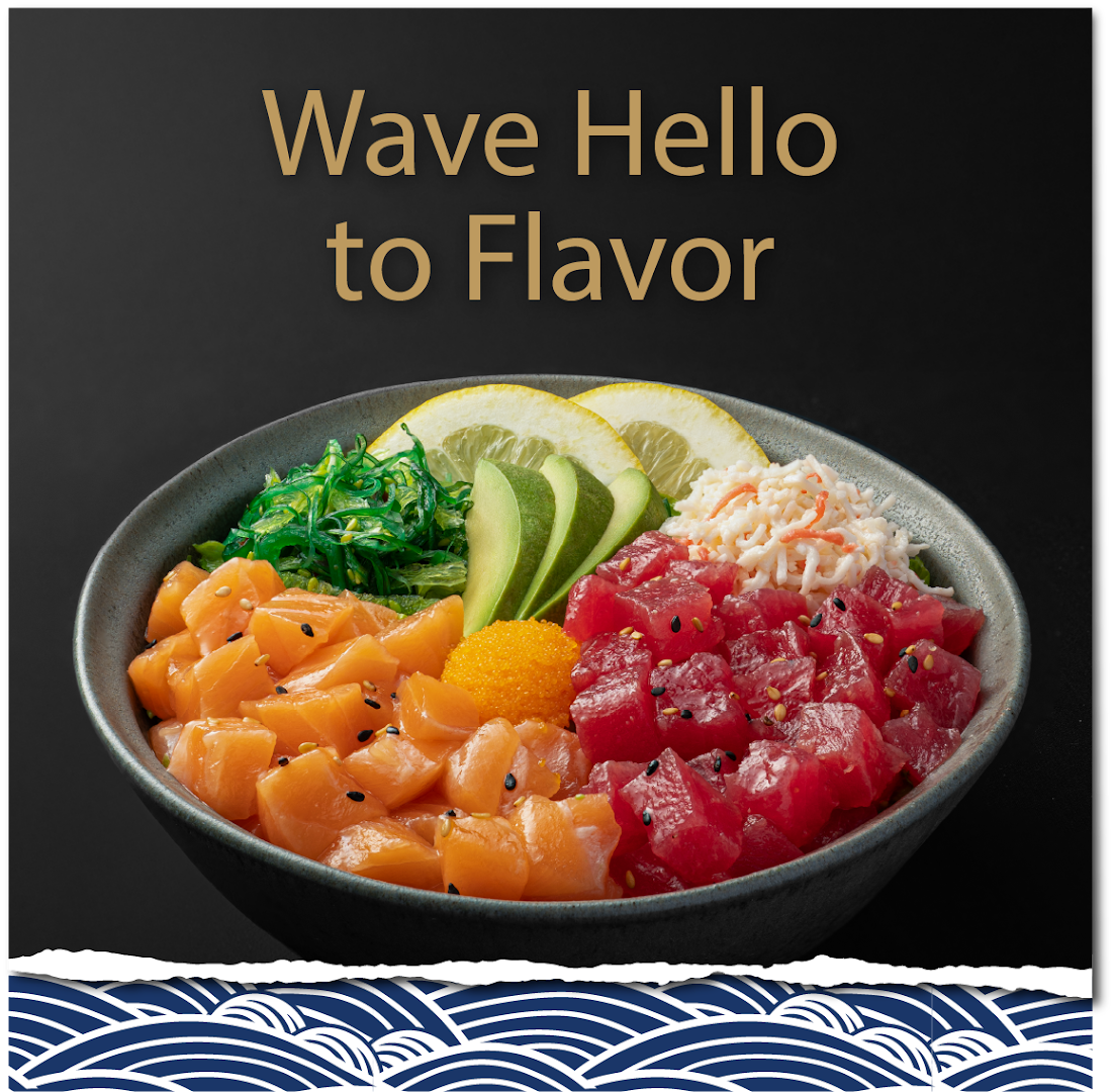 Handcrafted Sushi Rolls, Marinated Tuna, Salmon, Avocado Bowls, Grilled Shrimp Dumplings, Sushi Party Platters